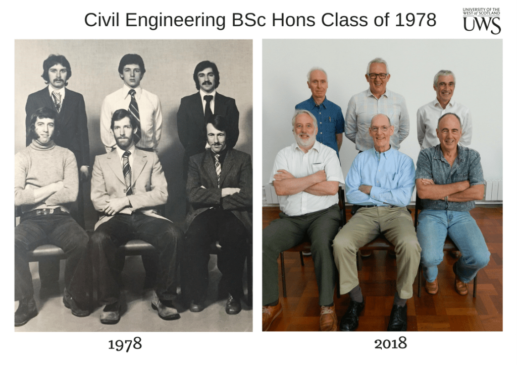 Almost 40 years to the day the BSc Hons Civil Engineering class of 1978 met again for the first time since graduation in Paisley on 7th July 1978. The full class of six were joined by former staff members Professor Ian MacLeod who was head of civil engineering, and Bob Hardy who was the senior lecturer of the Structures Group to celebrate 40 years since graduating.