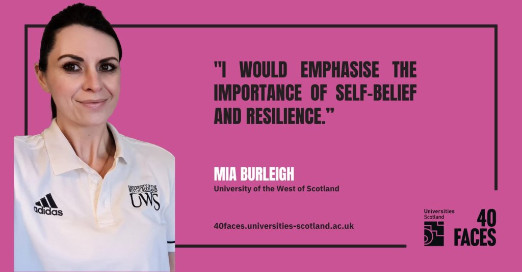 In 2014, by then a single mother of two young children, Mia completed an HND in Applied Sport and Exercise Science at Ayrshire College as a mature student and was offered a place for direct entry to the third year of the BSc (Hons) Sport and Exercise Science programme at UWS. In doing so, Mia became the first person in her family to attend university.