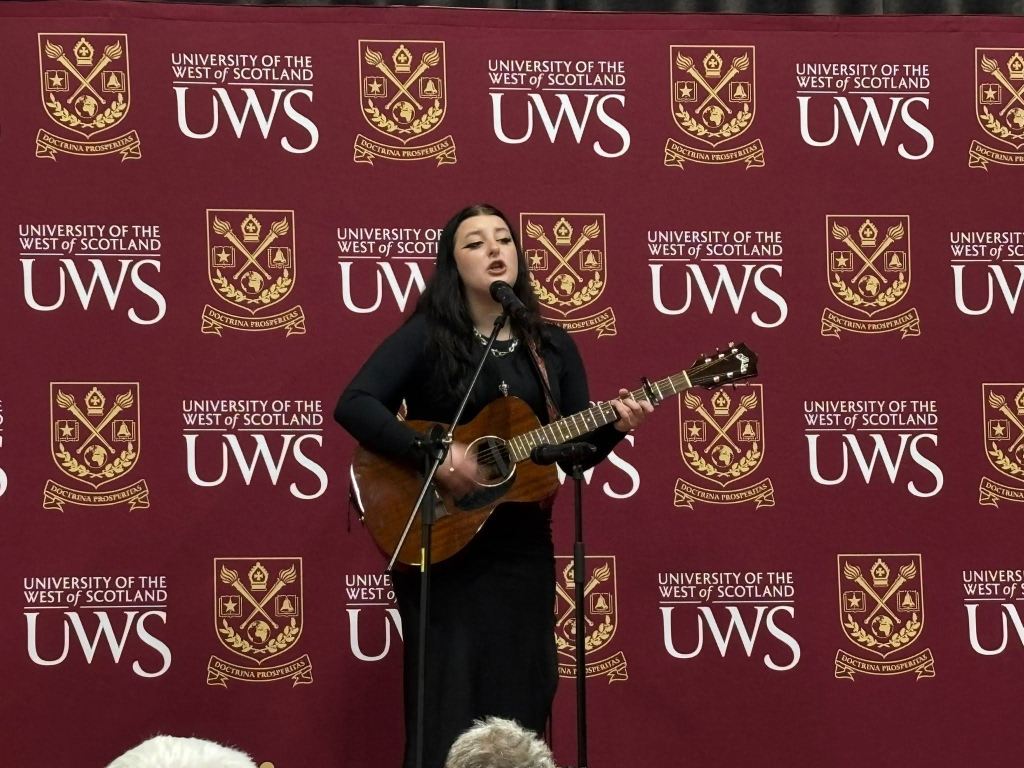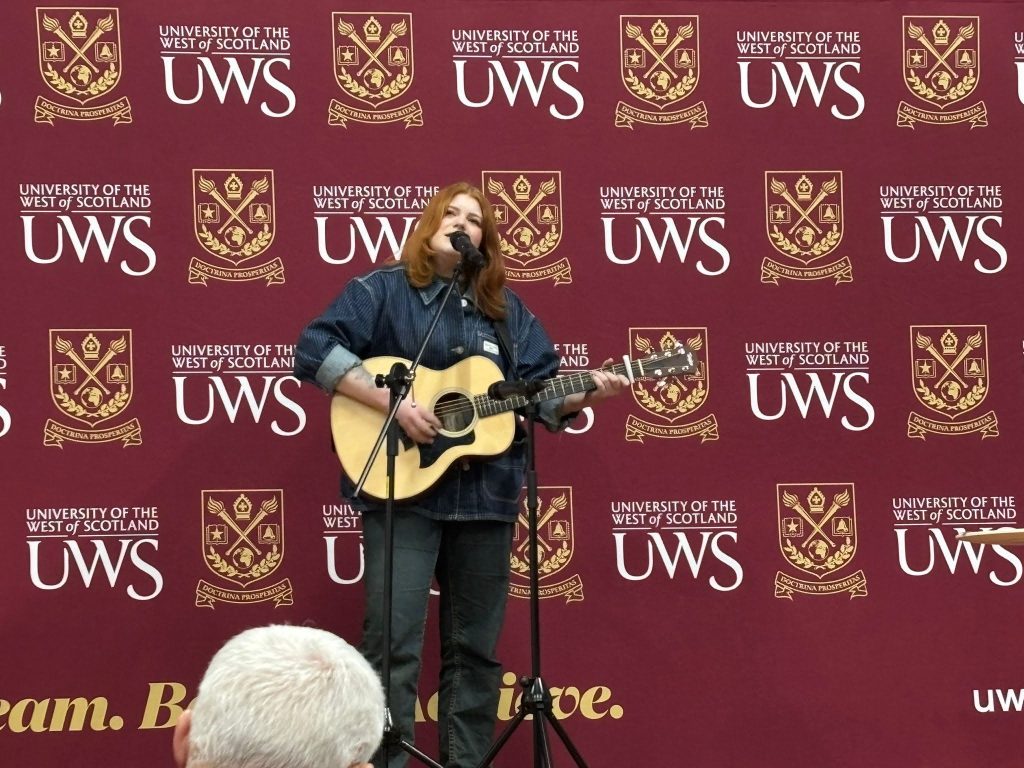 Guests were then treated to musical performances from BA Commercial Music students Lorna Lynne and Morrie Dolan. Lorna joined the celebration fresh from her first ever tour with the band Pistol Daisys, playing two shows in the legendary Barrowland Ballroom with Callum Beattie. 22-year-old Morrie Dolan has just released her debut EP “Disaster” and is on track to release her second EP at the end of March 2025.